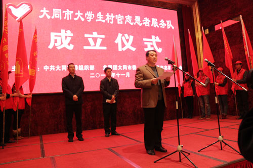 在成立仪式现场,团市委组织召开了大同市大学生村官志愿者服务队骨干暨关爱农民工子女志愿服务行动项目专员培训会。就志愿服务基本知识,关爱行动的重要意义、项目要求、工作方向进行了深入的讲解。