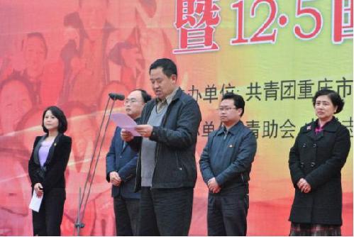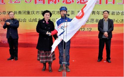 12月4日下午,“冬日阳光·温暖你我”2013年新春关爱行动启动仪式暨“12·5”国际志愿者日主题活动在重庆市人民大厦广场隆重举行。市政府副市长童小平出席活动并为骑行志愿者服务队授旗,市政协副主席于学信出席活动并讲话,团市委书记周波,渝北区委副书记黄宗华,团市委副书记施崇刚,团市委党组成员叶力娜,以及骑行志愿者服务队志愿者代表,NGO、自行车俱乐部、网络论坛的志愿者代表、留守儿童代表600余人参加活动。团市委党组成员任丽娟主持仪式。