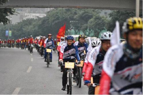骑行志愿者们一起喊出口号“千里骑行,只为你!”