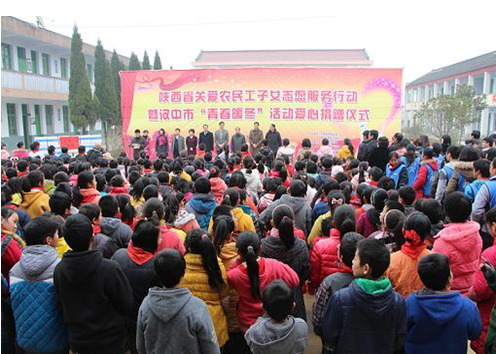 中国青年志愿者网讯 1月8日下午,陕西省关爱农民工子女志愿服务行动暨汉中市“青春暖冬”活动爱心捐赠仪式在南郑县胡家庙镇中心小学隆重举行。团省委副书记徐永胜,汉中市委常委、组织部部长李九红,市政府副市长王春丽等领导出席了仪式。青年志愿者及胡家营镇中心小学师生500余人参加了活动。