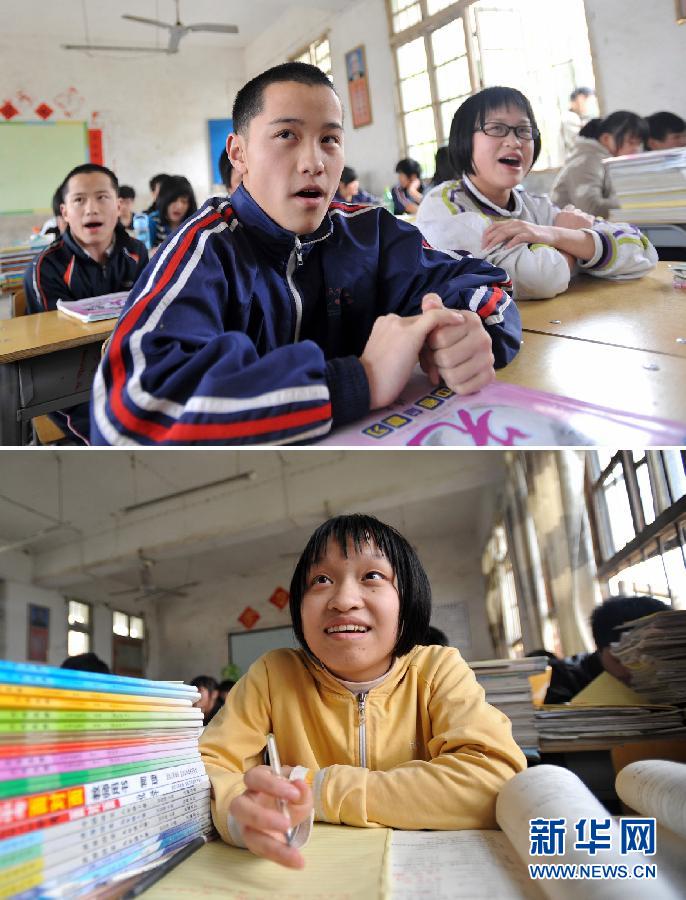 (上图)3月21日,梁乐健(左后)、梁乐保(前左)和梁乐桂(前右)在课堂上跟读课文。(下图)3月21日,梁乐林在课堂上认真听课。