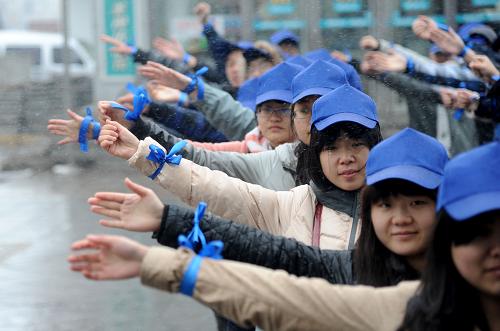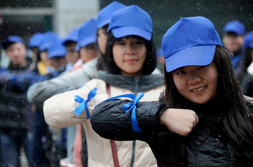 3月31日,东北大学的志愿者在雪中展示自己佩戴的象征关爱自闭症患者的蓝色丝带。当日,为迎接4月2日世界自闭症日,一场特殊的“蓝色行动”——关爱自闭症儿童活动在沈阳展开。东北大学百余名大学生志愿者走上街头,通过舞蹈、诗朗诵等形式,让更多的人了解自闭症儿童这个特殊群体,呼唤公众对自闭症儿童更多的关心和爱护。新华社发(张文魁摄)
