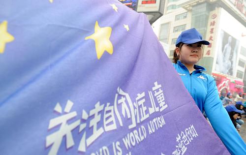 3月31日,东北大学的志愿者展开旗帜,呼唤公众对自闭症儿童更多的关心和爱护。新华社发(张文魁 摄)