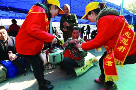 1月23日中午,桂林师范高等专科学校两名志愿者在火车站门口给旅客倒开水。