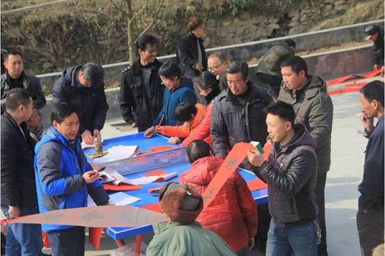 在第二站,志愿者们搭起了台子,持续为当地贫困群众发放爱心物资,特别是现场义诊、拍摄全家福、书写春联等活动场面火爆,拥满了大堆人群,老人、小孩儿一个个像乐开了花似的。志愿者们一个个精神饱满,忙碌并快乐着,中午只匆匆以自带的零食充饥。直到下午4点多才给乡亲们挥写完最后一副春联。