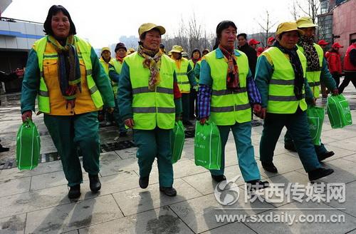 1月29日,共青团西安市委联合市市容园林局、经开区管委会、中建七局第四建筑有限公司共同举办了“关心关爱您我同行”西安青年关爱环卫工人、参与治污减霾志愿服务活动,他们将100套装有保温饭盒、手套、围巾等御寒物品的“温暖包”送到经开区正在劳动的环卫工人手中,叮嘱他们注意防寒保暖、劳动安全。(记者袁景智 李晓红 摄)