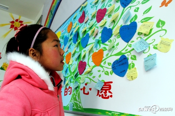 问她想不想爸爸妈妈,她坚定地说:“不想,因为她们在我很小的时候就离开了我。”,但是在心愿树上我们找到她写的话,上面写的却是:“爸爸妈妈我想你们快点回来!”