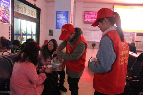 江西 江西九江青年志愿者在火车站候车室为候车旅客送温暖