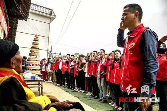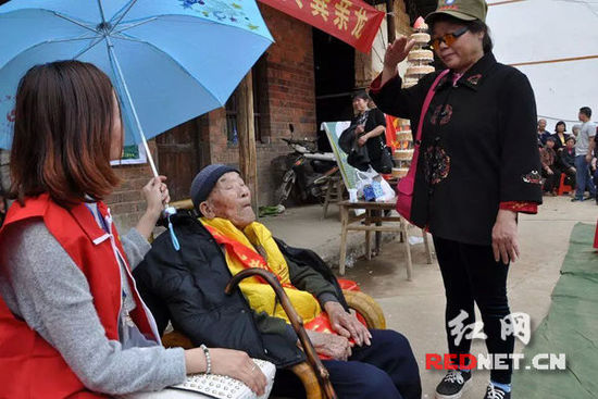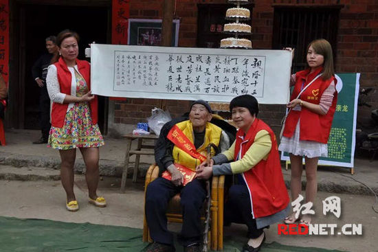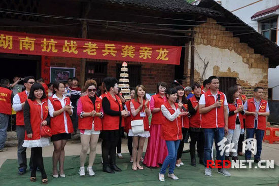 红网武冈4月27日讯(通讯员 关杨博)4月25日上午,武冈抗战老兵龚亲龙迎来了他的百岁生日。来自邵阳、武冈、洞口、新宁、城步、永州及广西桂林的百余名爱心志愿者在武冈义工联组织下,来到大甸乡枫木村,为龚老的百岁寿辰送上美好祝福。