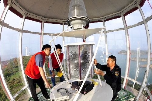 4月28日,北麂山灯塔主任杜忠良(右)向志愿者吴昊(中)和孙毅(左)讲解如何维护灯塔的灯器。 新华社记者 张建松 摄
