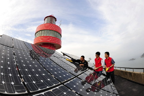 4月28日,北麂山灯塔主任杜忠良(左)带领两名志愿者清洁灯塔的太阳能板。新华社记者 张建松 摄