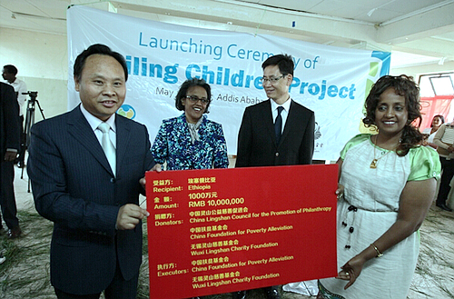 2014年5月,埃塞第一夫人罗曼塔斯法耶夫人应邀出席了中国扶贫基金会和无锡灵山慈善基金会在江苏无锡灵山联合举办的“民间帮助民间——公益非洲论坛”,并接受了中国灵山公益慈善促进会捐赠的1000万元人民币。有关各方商定,该笔捐赠用于微笑儿童埃塞俄比亚实验项目,为埃塞受饥儿童免费供餐,项目周期为5年,由中国扶贫基金会和无锡灵山慈善基金会联合执行。