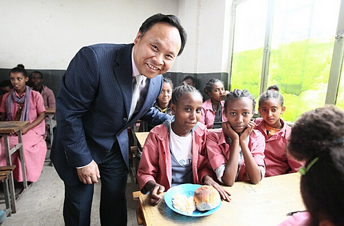 在仪式上,孟尼利克二世小学校长哈布塔姆先生,亚的斯亚贝巴市教育局副局长海勒拉希姆先生和亚的斯亚贝巴市妇女、儿童和青年事务局副局长翟德女士纷纷发言对中国扶贫基金会和无锡灵山慈善基金会来埃塞开展微笑儿童项目表示感谢。中国扶贫基金会王行最副会长代表中国扶贫基金会和无锡灵山慈善基金会向埃塞母性之本慈善协会捐赠了1000万人民币,埃塞第一夫人罗曼塔斯法耶女士向36所项目受益学校校长代表赠送了项目学校标示牌,孟尼利克二世小学受助学生代表,一位盲人小男孩朗诵了阿姆哈拉语的诗词,他充满感激的声音打动了在场每位观众的心,赢得了全体热烈的掌声。最后埃塞第一夫人罗曼塔斯法耶女士为微笑儿童项目启动剪彩,并与中国驻埃塞大使腊翊凡先生和中国扶贫基金会王行最副会长一起为项目受益学生发餐,合影留念。启动仪式在欢乐和谐的氛围中圆满结束。