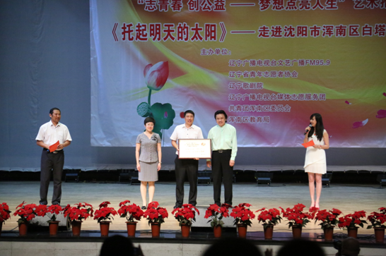 6月15日下午,由辽宁广播电视台文艺广播(FM95.9)、辽宁省青年志愿者协会、辽宁歌剧院、辽宁广播电视台媒体志愿服务团、共青团浑南区委员会、浑南区教育局联合举办的“志青春﹒创公益――梦想点亮人生”艺术推广公益行动之 “托起明天的太阳”公益演出活动,走进沈阳市浑南区教育园区,为1000多余农民工子女送上精彩的文艺演出。团省委副书记张鹏,浑南区委常委、工会主席李广杰,辽宁广播电视台文艺广播总监晓君,辽宁广播电视台团委书记张兆赫,以及主办单位相关负责同志出席了本次活动。
