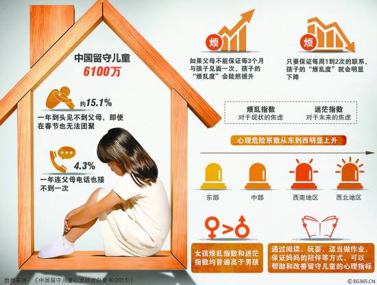 “调查结论与普遍认为的留守儿童至少在春节能见到爸妈的印象完全不同。同时,根据调查,如果保证不了每3个月见一次,孩子对于现在生存状况的焦虑及‘烦乱度’会陡然提升。”北京师范大学心理学教授李亦菲说,而只要保持每周跟孩子一到两次的联系,孩子的“烦乱度”会有明显下降。
