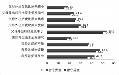 总体来看,留守女童负面情绪多、孤独感强。其原因:一是性别的差异使留守女童更需要父母的爱抚;二是家庭和学校的情感支持不能满足留守女童的心理需求;三是传统的社会角色期待加重了留守女童的心理负担。留守女童的家务负担远高于男童,也高于非留守女童。在为家庭转移更多劳动负担的同时,留守女童承受了更多的心理压力,这种心理压力与父母外出带给她们的心理影响叠加在一起,不仅影响了她们的身心健康,也可能会影响到她们未来的发展。