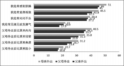 父母都在外地的留守儿童最多,占51.7%,其次是父亲外出的,占40.2%,母亲外出的最少,占8.1%,但母亲外出的留守儿童在各个方面的问题最突出。他们生活习惯更差,网络不良行为更多,意外伤害更多,对留守生活的负面体验也更高;学校表现更糟糕,遭受欺负的比例更高;在自我接纳和人际交往方面,母亲外出的留守儿童表现矛盾,他们觉得自己更有用,同时也觉得别人比自己运气好;他们觉得自己更受人欢迎,但不愿意和别人谈话聊天;他们认为自己的好朋友更多,但无助感最强。