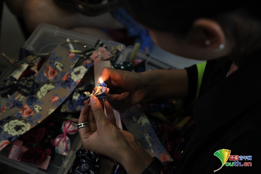 马祎做每一个发卡都很认真,怕不牢固会反复用火烧,用胶粘。中国青年网记者 曹迪 摄