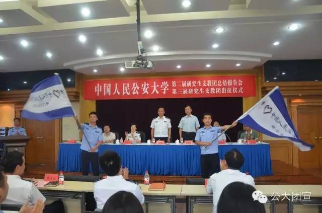 2015年7月2日下午14时,公安大学第二届研究生支教团总结报告会暨第三届研究生支教团出征仪式在木樨地校区举行。校党委书记、校长程琳,团中央志工部党组书记侯宝森,校党委委员、副校长席艳丽出席仪式,团中央志工部项目管理处副处长毛怀远,支教团支教地内蒙古自治区伊金霍洛旗团委书记马东,广西壮族自治区凌云县团委书记文金福与学校党委宣传部、教务处、研究生院、学生工作处等校属单位负责人参加活动。