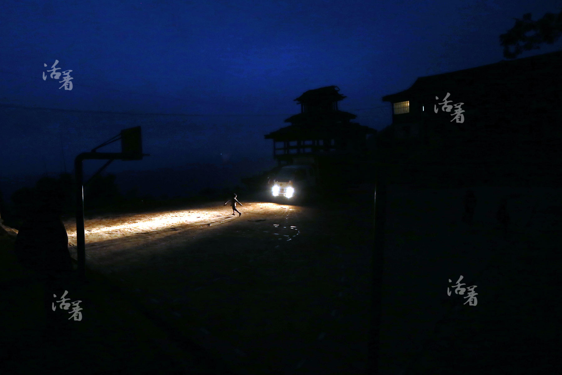 夜幕降临,校园操场上玩耍的孩子。大歹苗寨中及通往该寨的道路均为泥沙路,约四百平米的学校操场是该村方圆数公里唯一的成片水泥地。