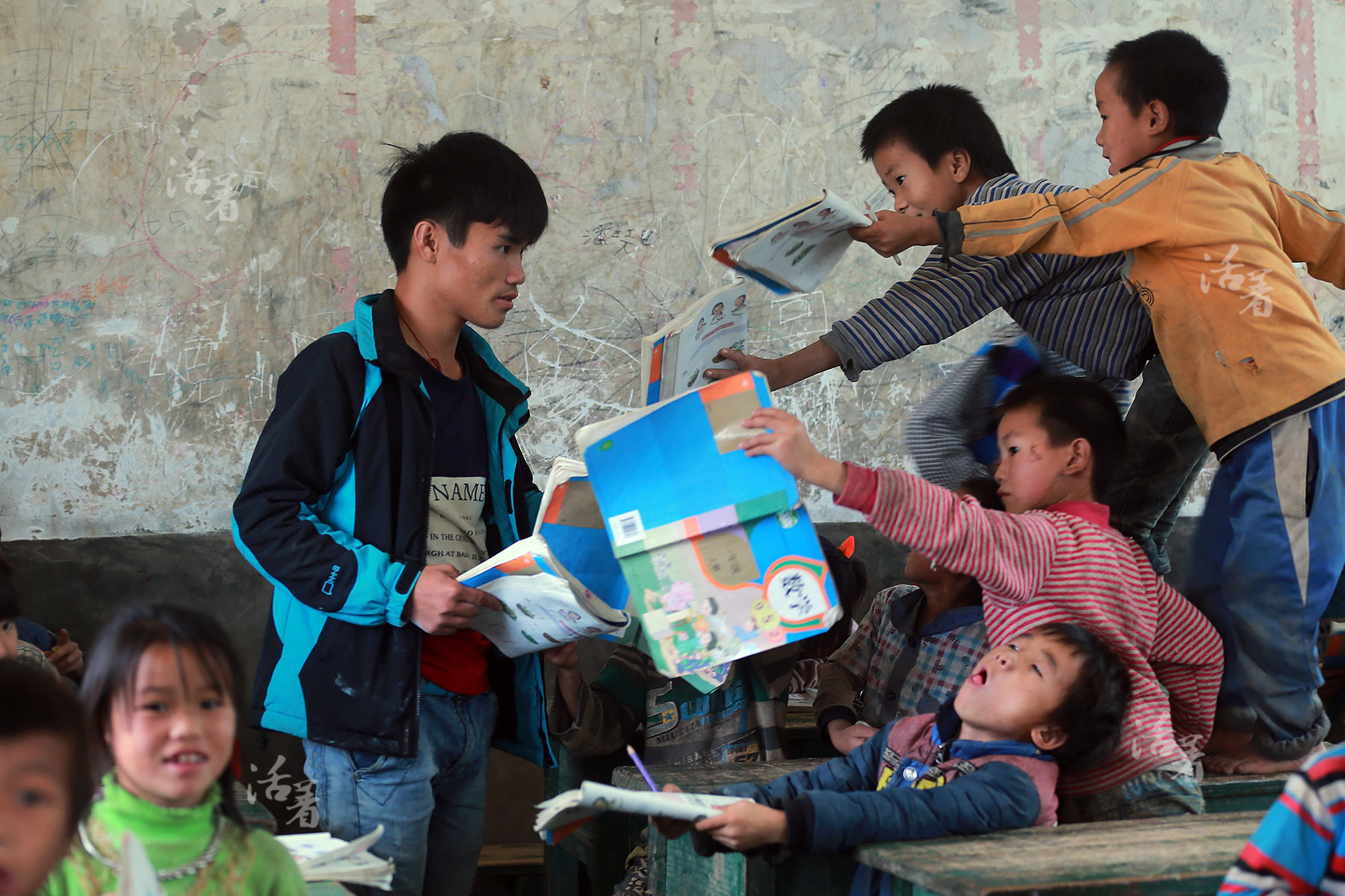 一年级课堂,潘祥当在检查作业时,孩子们爬上桌子向他围来,性格腼腆的他几乎从不责骂任何学生。“其实我能教会他们的并不多,又都是一个寨子的,责怪他们不好”,潘祥当说。