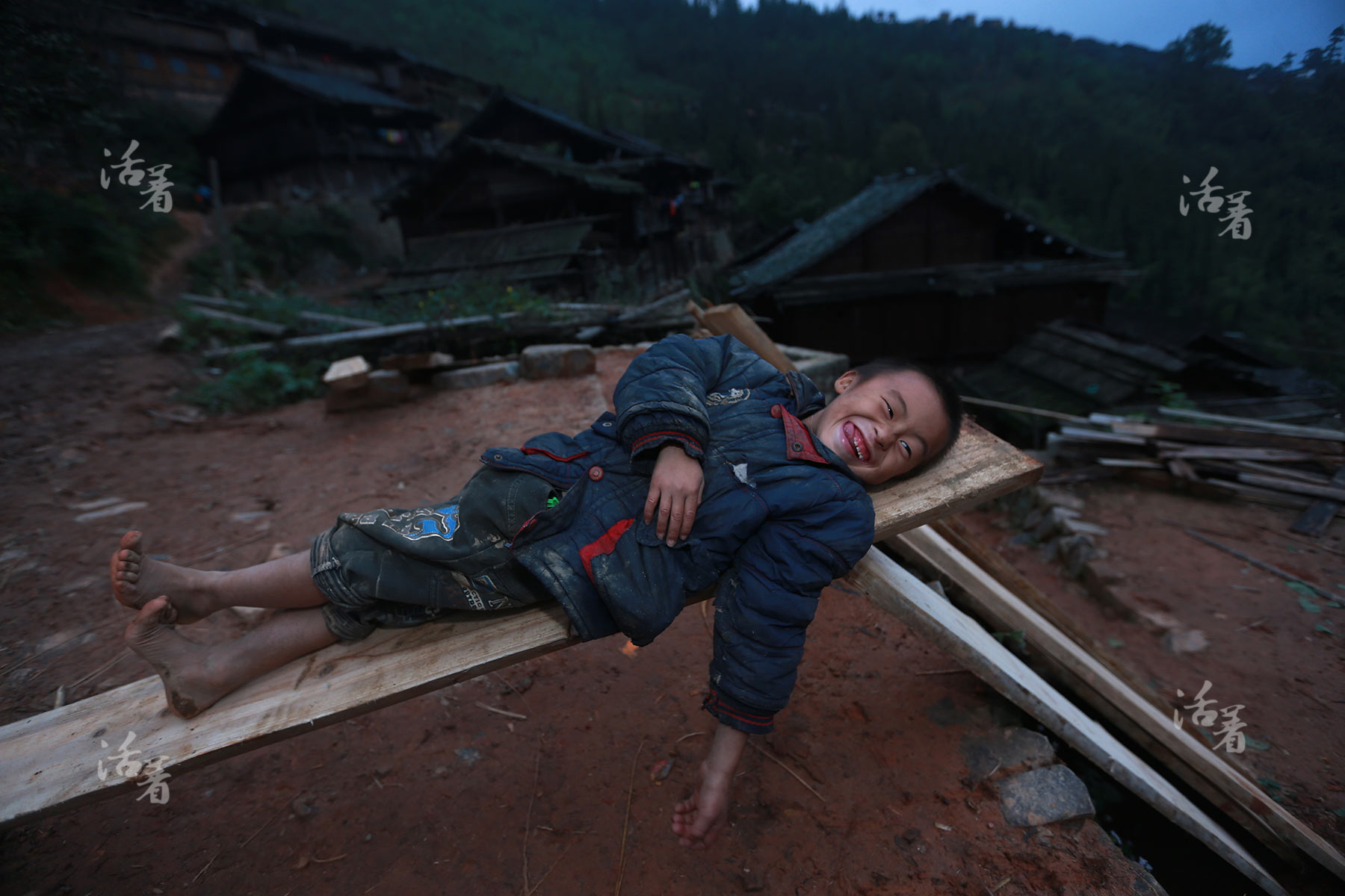 一名孩子躺在用来建新房的木材上,用扮鬼脸的方式向潘祥当打招呼。湿冷的秋雨季,光光的脚丫,一路上,类似这样像“潘老师”致意的孩子还有很多。