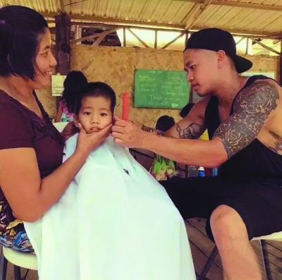 2012年小伙子回菲律宾老家探亲的时候,为孩子们理发,“那感觉真好”。