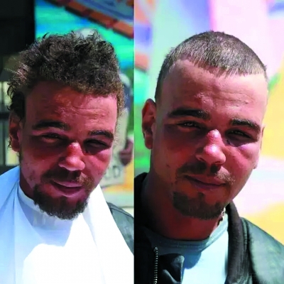 有一些路人会停下来观看,而另一些会直接走开,可是每一个流浪者,却都会接受Mark的好意,坐下来,把脑袋交给他。然后,让他们震惊的是:当剪好头发,他们的人生好像看起来完全不一样了。