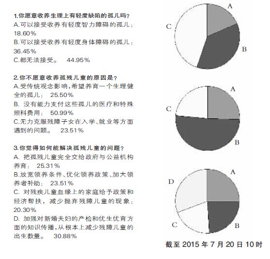 本期问卷于7月16日10时发布,截止到7月20日10时,共有1059名网友参与调查。调查显示,超一半(55.05%)网友有意愿收养生理上有轻度缺陷的孤儿,这其中的三分之二受访者偏向于收养有轻度身体障碍的孤儿,另三分之一愿意收养有轻度智力障碍的孤儿。而被问及不愿意收养孤残儿童的愿意时,一半网友认为自己无能力支付他们在医疗和特殊照料方面的费用,四分之一网友受传统观念影响,另四分之一网友止步于残障人士在入学就业方面的压力。