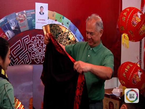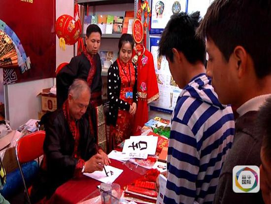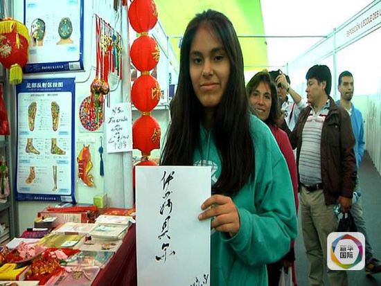戴国联从未把自己看成中国图书展台的“看摊人”。他不仅负责摆放图书、推销图书,还像中国志愿者一样为围观求字的秘鲁观众题写汉字姓名。写字前,他还要穿上黑色红织锦镶边的汉服,然后拿起毛笔,潇洒地题字。他说:“虽然这个场地不是很大,但却是一个宣传中华文化的平台,许多人对中国汉字都那么感兴趣,我非常高兴能为他们做点事儿。”