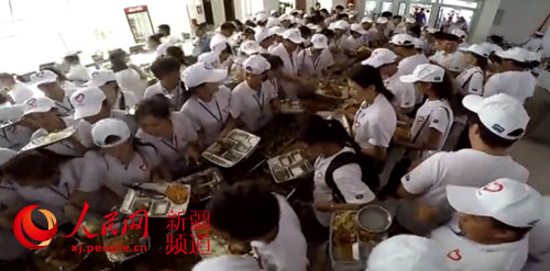 来自全国的西部计划志愿者在新疆农业大学就餐。视频截图