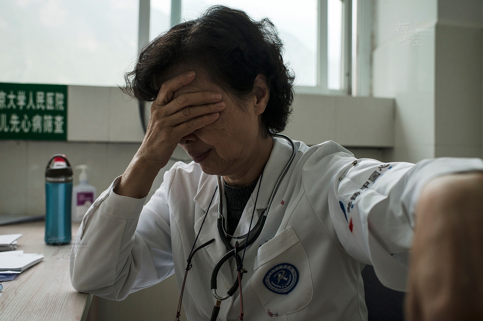 平均海拔3500米的高原,对于义诊医生和志愿者来说也不是那么容易吃得消的。在九寨沟县人民医院,一名医生顶着高原反应做义诊,只能无人时短暂地休息一下。她刚刚替一位一岁多的孩子进行了心脏检查,这个孩子是一位高龄产妇的二儿子,大儿子在17岁时因先心病离世。