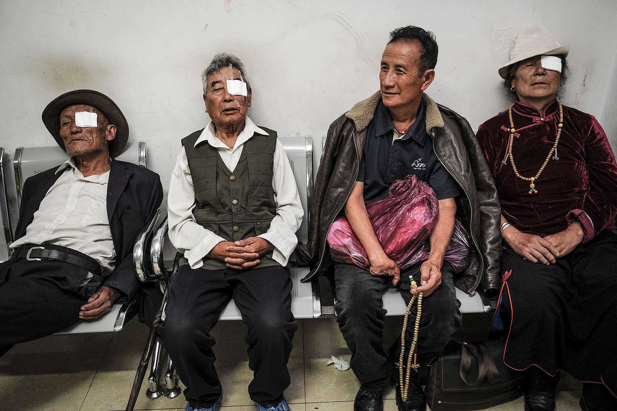 7月8日,接受完白内障手术的患者并排坐在医院的走廊里。由于空气稀薄、紫外线强,高原地区的白内障发病率也非常高。