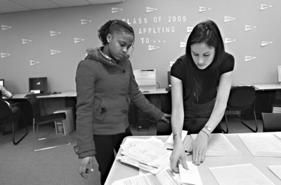 萨拉(右)是底线基金会的导师,她正在帮助一名学生挑选合适的大学