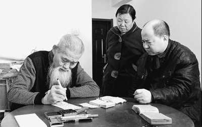 何秀奎(见图,左一。本报记者朱少军摄)老人一边把脉,一边细问病情。病人来自邻村的张家窝,脊柱受过伤,已经来何秀奎老人这里看过几次病了,吃了药之后感觉症状在减轻。病人感激地说:“何大爷脉象摸得特别准,管用还不收钱。”
