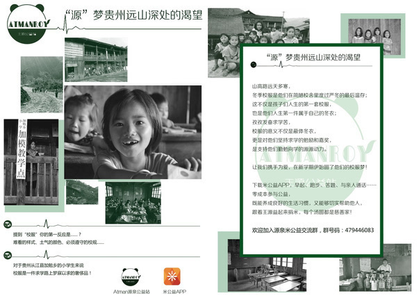 为了完成愿望,源泉首先通过热心人士找到了一群帮助的孩子——贵州从江县加勉乡的小学生。在贵州从江县加勉乡这个地理偏僻、气候恶劣、资源匮乏的地方,这批小孩在天寒地冻的冬天缺少冬衣。通过实地考察探访确认了学校的实际情况、了解孩子的切实需求之后,源泉找到了米公益平台,希望在立秋之前汇聚更多关注和爱心力量,为孩子们送上他们的第一套冬季校服。