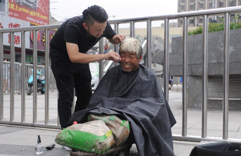 8月4日,理发师红涛(左)在郑州火车站东广场为一位流浪人员理发。从7月21日开始,一位名叫红涛的理发师每逢周二在郑州街头免费为流浪人员理发,他希望用此项行动呼吁大家关注街头流浪人员群体。