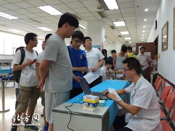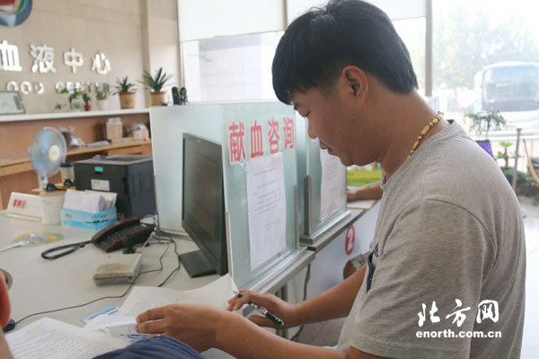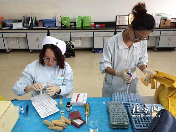 8点10分,天津市血液中心开始为献血者进行体检、登记录入。采血人员正在为化验紧张地做着准备。本来应该休息的郑明在13日早7点接到了医院的来电,要紧急赶赴工作岗位加班采血。本打算送孩子去学前班的她,立刻把送女儿的任务交给了丈夫。20分钟后,郑明已经出现在工作岗位上。整个血液中心内,临时加班的医护人员有很多。为了救助更多的人,大家默默地忙碌着,紧张却有序。(北方网新媒体记者赵颖妍付文超血液中心报道)