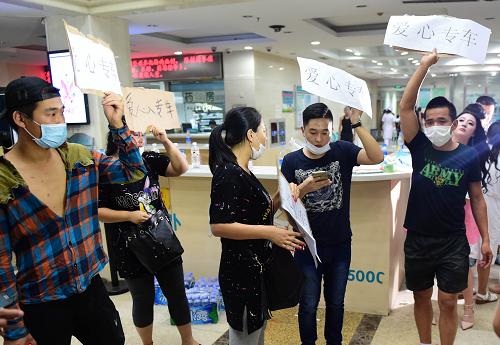 8月13日,志愿者在天津一家医院等候为伤者服务。在相关医院对因爆炸受伤人员进行抢救的同时,一些市民自发组织在一起,在医院为伤者和工作人员提供免费的食物、水以及专车接送,并为伤者献血。新华社记者张晨霖 摄