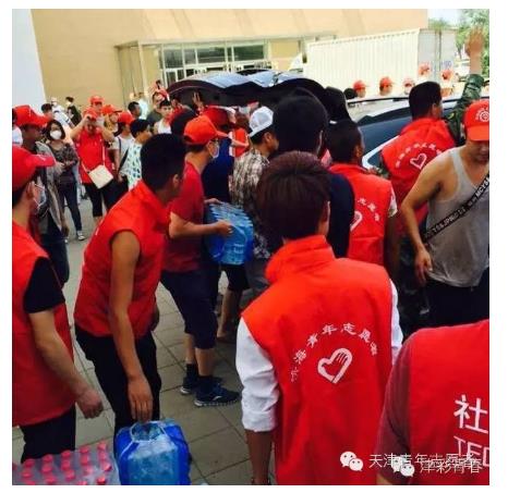事故所在区县的新滨海义工协会、滨海助残志愿者协会等青年社会公益组织积极参与,带领志愿者在天津滨海新区泰达二中、泰达二小等安置点,泰达医院、第五中心医院等主要救治医院,承担起秩序维护、物资发放、人员安抚等志愿服务工作,新滨海义工协会还组织200余名志愿者参与了义务献血服务志愿服务。具有专业救援能力的青年公益组织 蓝天救援队抵达距离事故现场最近的海港城小区和临时安置点,开展居民疏散、伤员救治、物资发放、人员安抚等志愿服务。 静海“与爱同行”志愿服务队组织志愿者积极投身义务献血活动,阳光义工爱心社紧急筹备了烧伤、烫伤药物物资,已送往伤员集中的第五中心医院。 河西区团辅志愿服务队组建了心理疏导志愿者团队,将开展事故救援、心理疏导工作。