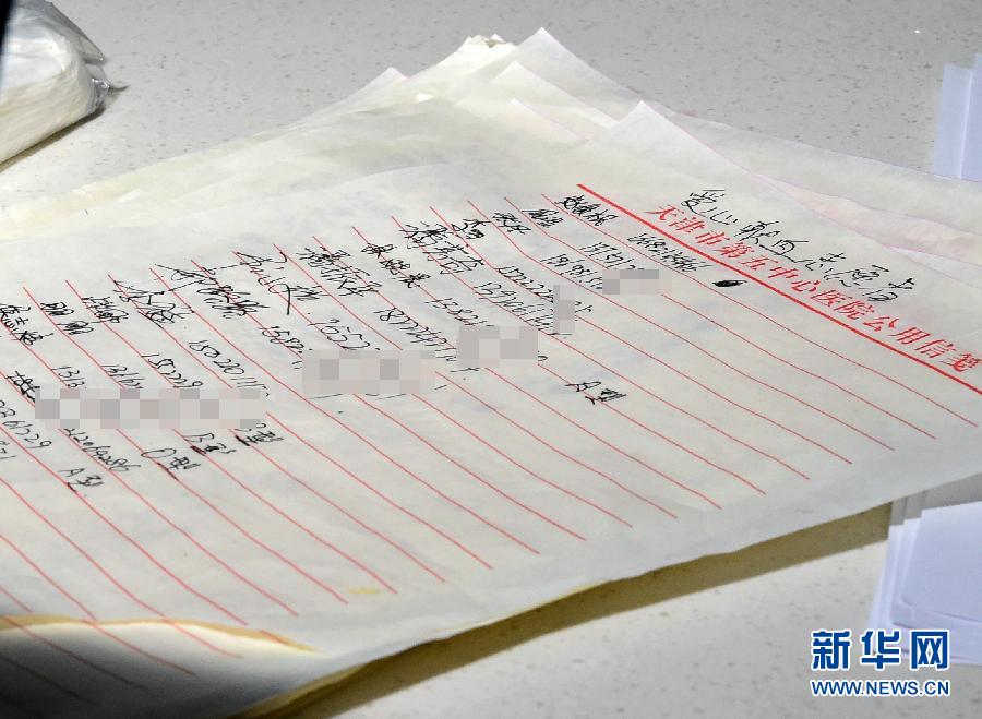 8月13日拍摄的爆炸后赶来医院献血者的名单。新华社记者张晨霖摄