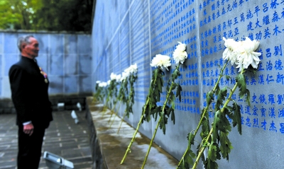 抗战老兵卢彩文在云南腾冲国殇墓园的中国远征军名录墙前拜祭战友