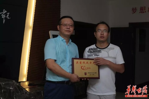 湖南老兵之家为湖南万鞋云商展览有限公司颁发“关爱抗战老兵爱心团队”证书。