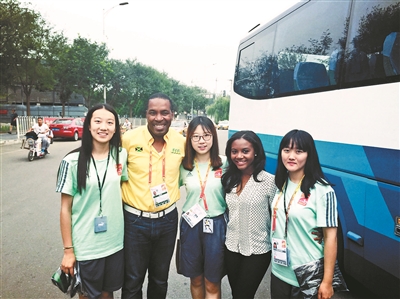 邢霞(右一)以优质的志愿服务赢得了牙买加代表团的高度赞誉