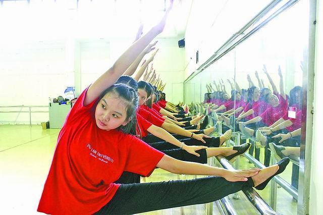 图为颁奖礼仪志愿者正进行压韧带训练。