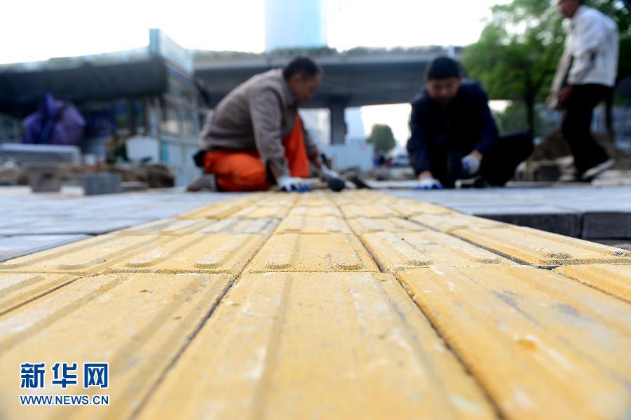 几名工人在安徽合肥市蜀山区一条改造中的人行道上铺设盲道(10月10日摄)。中国有世界最大的盲人群体:2014年的统计数字是500万,还有数以千万计的视力残疾人。中国已经有全球长度最长、分布最广的盲道。但有形的或无形的,外在的或心灵的障碍还是横亘在盲人和外部世界之间。 10月15日,又一个“国际盲人节”(白手杖节)到来之前,新华社记者带你走入盲人独有的平行世界,关注一个不仅这个日子应该关注的话题。新华社记者刘军喜 摄