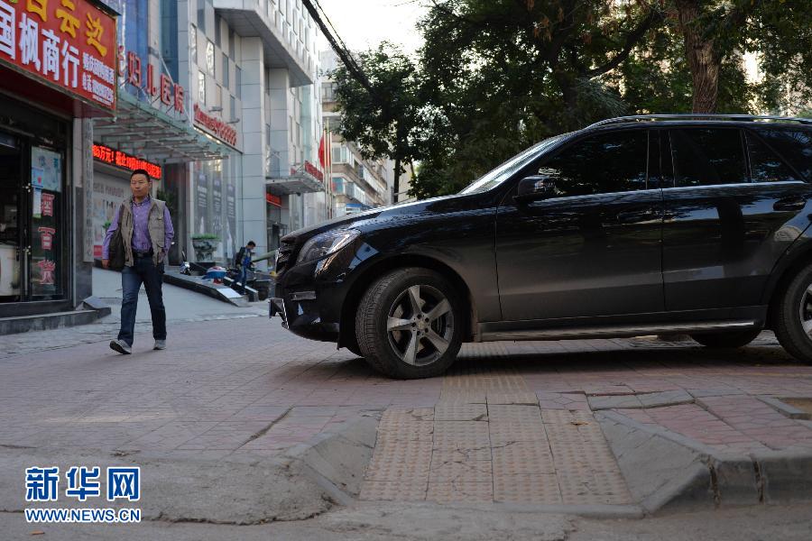 甘肃省兰州市城关区平凉路西侧时光整形医院附近,一段盲道被停靠的汽车占据(10月9日摄)。中国有世界最大的盲人群体:2014年的统计数字是500万,还有数以千万计的视力残疾人。中国已经有全球长度最长、分布最广的盲道。但有形的或无形的,外在的或心灵的障碍还是横亘在盲人和外部世界之间。 10月15日,又一个“国际盲人节”(白手杖节)到来之前,新华社记者带你走入盲人独有的平行世界,关注一个不仅这个日子应该关注的话题。新华社记者陈斌 摄