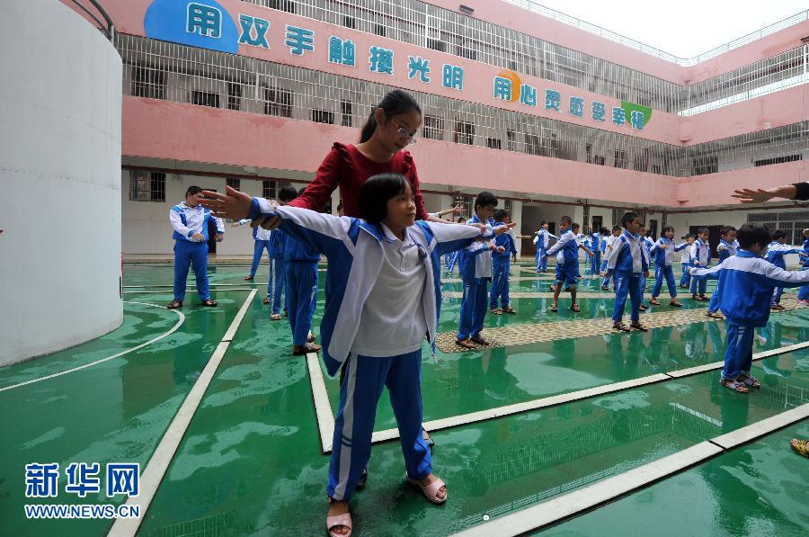10月13日,海南(海口)特殊教育学校的学生在老师的指导下做课间操。中国有世界最大的盲人群体:2014年的统计数字是500万,还有数以千万计的视力残疾人。中国已经有全球长度最长、分布最广的盲道。但有形的或无形的,外在的或心灵的障碍还是横亘在盲人和外部世界之间。 10月15日,又一个“国际盲人节”(白手杖节)到来之前,新华社记者带你走入盲人独有的平行世界,关注一个不仅这个日子应该关注的话题。新华社记者杨冠宇 摄