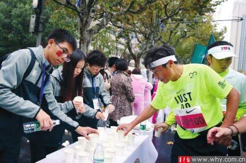 “上马”志愿者们为运动员提供饮用水。青年报记者 施培琦摄