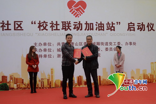 中国青年网北京11月17日电(通讯员茹峰)11月15日上午,团杭州市萧山区委和萧山区城厢街道党工委、办事处在江寺社区启动首个“校社联动加油站”。今后,“校社联动加油站”将通过与浙江建设职业技术学院开展校社联动志愿服务,促进资源互通,发挥共建优势,开展以社区居民需求为导向的志愿服务,彰显和谐社区“生活美”。